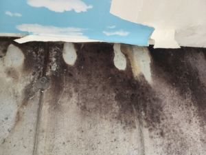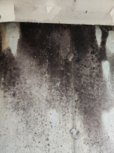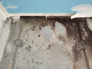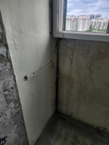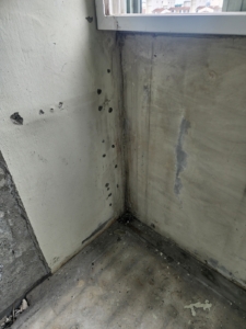 심각한 곰팡이 번식: 외벽면과 창문 주위, 천장과 벽 모서리 부위에서 광범위한 흑색곰팡이 및 수분 얼룩이 확인됨.