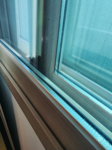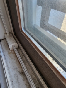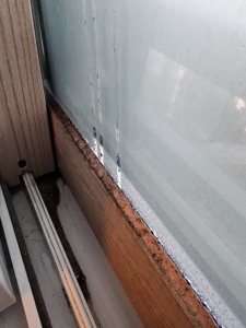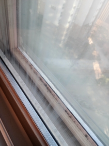 창틀 하부와 유리 맞닿는 라인에 결로수 고임 + 흑색 곰팡이