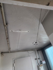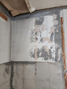 철거 후 타일 접착제 자국, 심한 곰팡이 오염 및 결로 자국 다수 확인