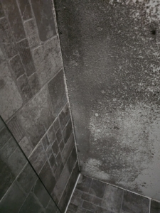 – 타일 코너 및 천장 몰딩 주위에 축축한 느낌과 습기 응결 자국