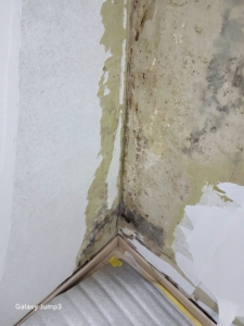 벽지 내부에 결로와 누수로 인한 심한 곰팡이 번식이 확인되었습니다.
