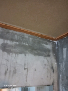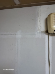 손상된 목재틀 교체 후, 새 석고보드 시공.