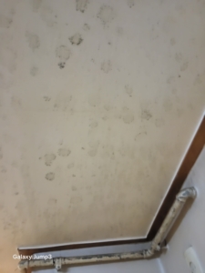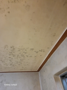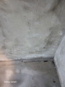 천장 및 벽면에 곰팡이가 광범위하게 번식한 상태.
