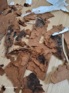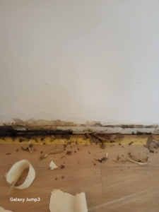 곰팡이가 벽지 → 석고보드 → 단열재까지 번식, 심한 경우 몰딩(걸레받이) 뒤쪽까지 침투.