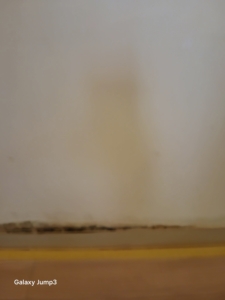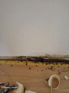 외벽 하단부 벽지와 석고보드가 심한 곰팡이 오염 상태.