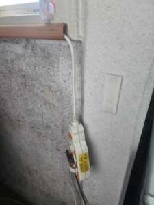 세탁기 뒤편, 가스배관 주변 벽과 천장에 검은 곰팡이 다량 발생