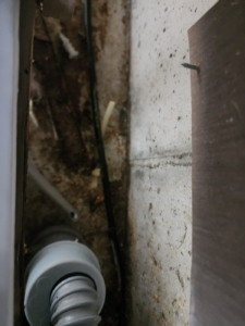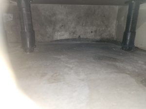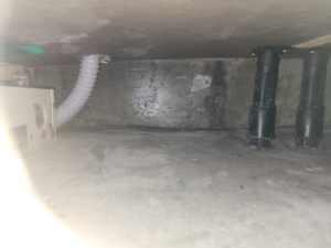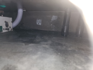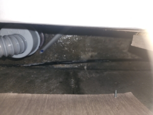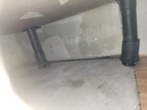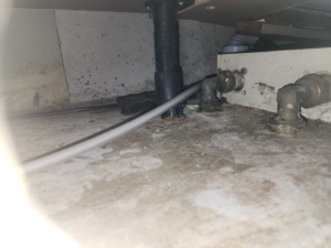 싱크대 하부장 내부에 물기 및 오염, 배수관 주변 곰팡이 번식 확인됨.
