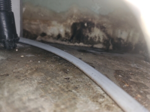 바닥과 벽면 접합부, 배선 주변, MDF 벽체 하단 등에서 곰팡이 군락과 수분 흔적이 뚜렷하게 나타남.